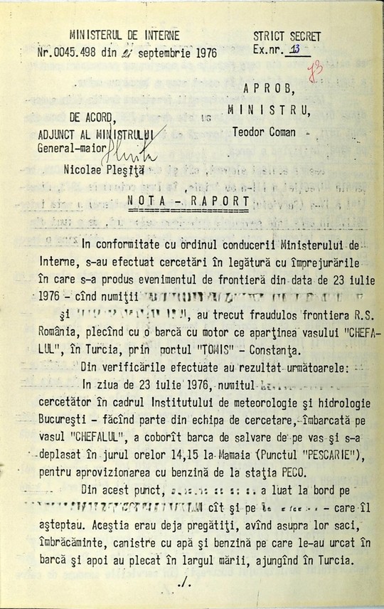 ”Mai mult, cu câteva luni înainte, o sursă a Securităţii semnalase că o tentativă de a fugi din ţară folosind barca de salvare a navei „Chefalul” avusese loc şi în data de 23 august 1975, dar a fost anulată de cei implicaţi din cauză că organele de securitate impuseseră măsuri suplimentare de pază şi verificare, dat fiind semnificaţia specială a acelei zile. Ofiţerii de securitate care au primit semnalările nu le-au verificat şi, cu rare excepţii, nu le-au comunicat unităţilor responsabile, pentru a lua măsurile necesare în scopul prevenirii plecării ilegale din ţară”, mai relatează CNSAS, publicând o Notă-Raport pe această temă.