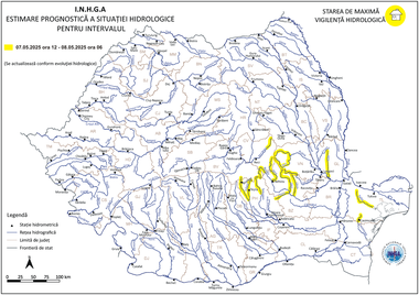 Institutul Naţional de Hidrologie şi Gospodărire a Apelor (INHGA) a emis, în contextul evoluţiei hidrometeorologice actuale şi al prognozei pentru următoarele 24 de ore, o atenţionare Cod Galben de inundaţii, valabilă de miercuri, de la ora 12:00, până joi, la ora 06:00.