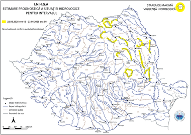 Institutul Naţional de Hidrologie şi Gospodărire a Apelor (INHGA) a anunţat că a emis o atenţionare Cod galben, valabilă începând de joi, de la ora 12:00, până vineri, la ora 8:00, pe anumite sectoare de râuri din judeţele Suceava, Neamţ, Harghita, Bacău, Vrancea, Covasna, Iaşi, Vaslui şi Galaţi, unde există probabilitatea depăşirii cotelor de atenţie.