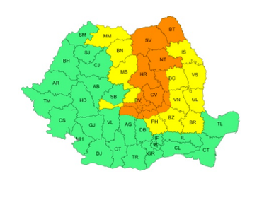 ANM a emis o altă atenţionare Cod galben, privind instabilitate atmosferică temporar accentuată, valabilă joi, între orele 3.00 şi 23.00, în judeţele Satu Mare, Maramureş, Sălaj, Bihor, Arad, Timiş, Caraş-Severin, Hunedoara, Alba, Sibiu, Cluj, Bistriţa-Năsăud, Mureş, Harghita, Braşov, Covasna, Prahova, Buzău, Vrancea, Bacău, Neamţ, Suceava, Botoşani şi în zona de munte a judeţelor Dâmboviţa, Argeş, Vâlcea, Gorj şi Mehedinţi.