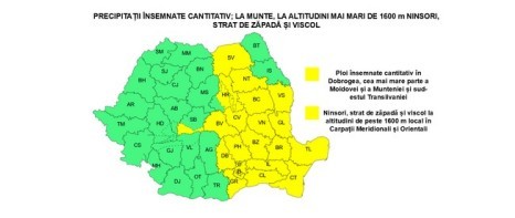 Administraţia Naţională de Meteorologie (ANM) a emis o atenţionare Cod galben de precipitaţii însemnate cantitativ, ninsori la munte, la altitudini mai mari de 1.600 de metri, strat de zăpadă şi viscol, valabilă de duminică, de la ora 10.00, până luni, la aceeaşi oră, în judeţele Suceava, Neamţ, Bacău, Vaslui, Vrancea, Galaţi, Brăila, Tulcea, Constanţa, Ialomiţa, Călăraşi, Giurgiu, Ilfov, Dâmboviţa, Prahova, Buzău, Braşov, Covasna, Harghita, în municipiul Bucureşti şi parţial în judeţul Sibiu.