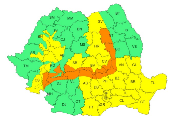 Codul portocaliu vizează unele zone ale judeţelor Neamţ, Bacău, Vrancea, Buzău, Prahova, Dâmboviţa, Argeş, Vâlcea, Gorj, Mehedinţi, Caraş-Severin, Hunedoara, Sibiu, Braşov, Covasna.