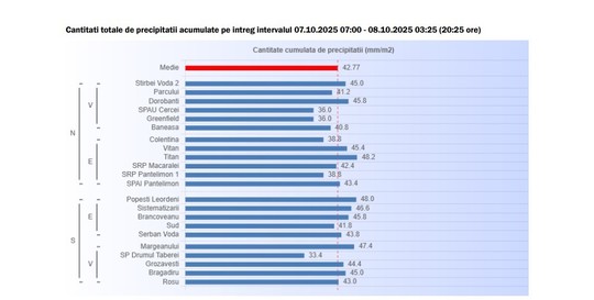 Compania precizează şi că, de la începtul lunii şi până miercuri, 8 octombrie, s-a cumulat o cantitate medie de 101.12 l/m2 , reprezentând ~228 % raportat la cantitatea medie multianuală.