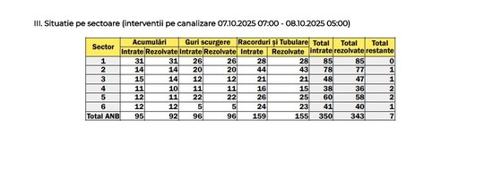 Aproape 350 de sesizări primite din partea clienţilor şi a autorităţilor au fost soluţionate până la primele ore ale dimineatii zilei de 08 octombrie de exhipele de intervenţie ale Apa Nova..