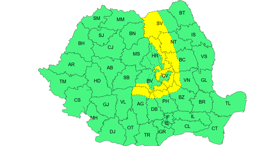 Potrivit ANM; vineri, în intervalul 10 –21, este cod galben în Banat, Crişana, Maramureş, Transilvania, Oltenia, vestul şi centrul Munteniei, Dobrogea şi în zonele de munte
