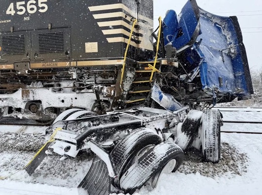 : A train has collided with a semi-tractor-trailer after the vehicle became immobilized in the snow.