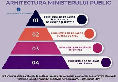 ”Peste 100 de procurori din cadrul parchetelor de pe lângă judecătoriile din ţară şi 3 procurori din cadrul parchetelor de pe lângă tribunale s-au înscris la concursul de promovare efectivă în funcţii de execuţie organizat în perioada martie – septembrie 2025”, a transmis, marţi, CSM, într-un comunicat de rpesă.