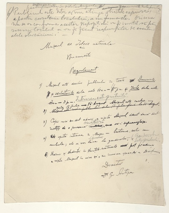 ”Copiii mici nu sunt admişi a vizita Muzeul decât dacă sunt însoţiţi de o persoană matură, care să-i supravegheze. Este oprită intrarea în Muzeu cu bastoane, săbii sau umbrele; ele se vor lăsa la garderobă. Străinii şi studenţii în ştiinţele naturale pot fi admişi a vizita Muzeul în orice zi, cu învoire specială a Direcţiunii”, sunt alte reguli scrise de Grigore Antipa, conform documentului făcut public de muzeu.