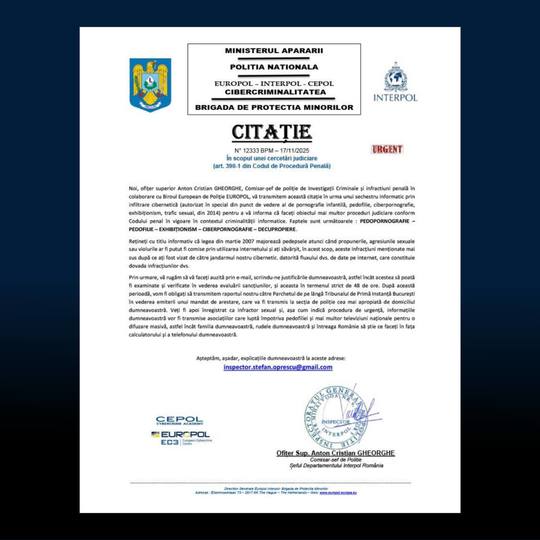 ”Atenţie la mesajele, link-urile şi documentele primite din surse necunoscute sau suspecte! Atacatorii folosesc frecvent identitatea vizuală a unor instituţii precum Interpol, Europol, Poliţia Română, ANAF sau chiar DNSC pentru a crea aparenţa de credibilitate în tentativele de fraudă online”, avertizează, vineri, DNSC.