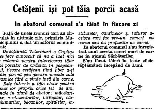 În numărul din 25 decembrie 1938, Gazeta municipală anunţa că „cetăţenii îşi pot tăia porcii acasă”, citând un comunicat al Primăriei Municipiului (pe atunci primar general era V. Dombrowski, n.r): „Direcţiunea Veterinară a Capitalei face cunoscut că nu a luat nici o măsură pentru interzicerea tăierii porcilor de Cărciun în gospodării, fiecare cetăţean fiind liber a-şi tăia porcul său pentru nevoile sale casnice fără a vinde însă din carne”.