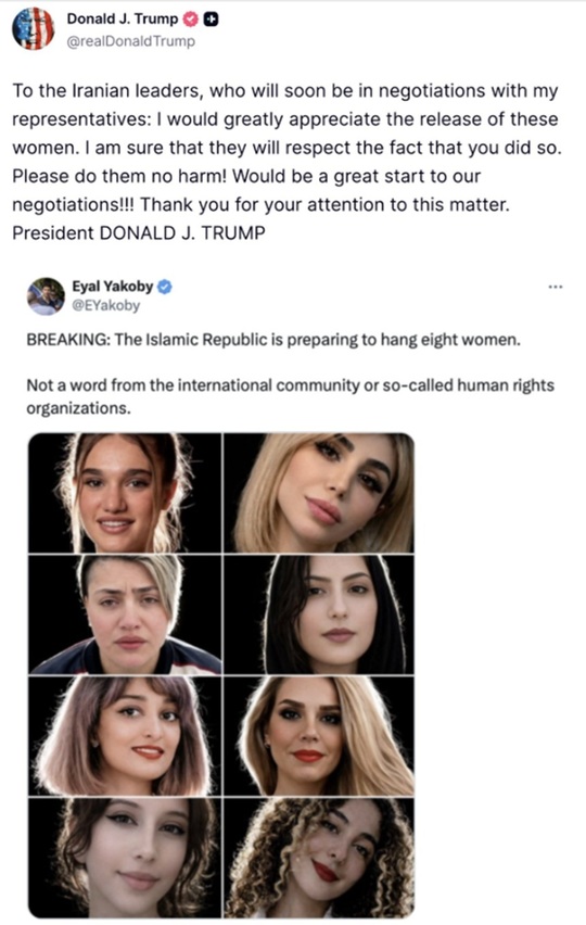 ”Liderilor iranieni, care vor negocia în curând cu reprezentanţii mei, le-aş fi foarte recunoscător pentru eliberarea acestor femei”, scrie pe reţeaua sa Truth Social Donald Trump, comentând un mesaj pe care-l repostează.