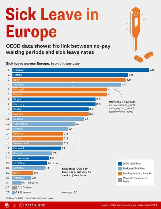 Un raport OECD pentru anul 2024 arată că România este pe locul 26 într-un top al numărului de zile de concediu medical luate pe an, cu o medie de numai o zi. La polul opus, cu cele mai multe zile de concediu medical pe an sunt ţări precum Norvegia, Finlanda, Spania şi Slovenia, urmate de Portugalia, Franţa, Belgia, Germania şi Austria. Tendinţa pacienţilor este să îşi ia concediu medical, fără conteze pentru ei dacă primele zile din acest concediu sunt plătite sau nu. De exemplu, în Portugalia primele trei zile de concediu medical nu sunt plătite, iar apoi angajaţii iau, pentru următoarele zile, 55% din salariu. Şi cu toate acestea au o medie de 4.1 săptămâni de concediu medical pe an.