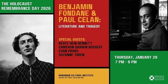 Evenimentul „Benjamin Fondane şi Paul Celan – literatură, memorie şi exil” din 29 ianuarie, la Sala „Norman Manea” a Institutului Cultural Român de la New York este dedicat vieţii şi operei celor doi scriitori evrei de origine română. Prof. Evan Parks, de la Columbia University, specialist în literatură şi studii culturale, va oferi, în calitate de keynote speaker, o prezentare axată pe contextul istoric, intelectual şi literar al operelor lui Benjamin Fondane şi Paul Celan, cu accent pe temele memoriei, exilului şi traumei istorice. Programul va include lecturi publice de fragmente selectate din operele celor doi autori, susţinute de actorii Cameron Darwin Bossert şi Suzanne Toren. Selecţia textelor este realizată de regizoarea Beate Hein Bennett, cu scopul de a ilustra relevanţa estetică şi etică a creaţiei literare a celor doi scriitori în contextul Holocaustului şi al literaturii postbelice.
