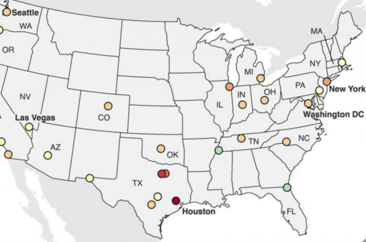 Cele mai periculoase orașe din acest punct de vedere sunt San Antonio, unde cercetătorii spun că una din 45 de clădiri este expusă unui risc ridicat, precum și Austin (una din 71), Fort Worth (una din 143) și Memphis (una din 167).