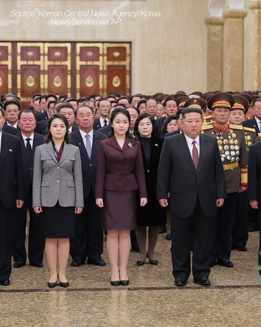 Kim a fost însoţit de soţia sa, Ri Sol Ju, şi de înalţi oficiali în cadrul vizitei din 1 ianuarie, Ju Ae aflându-se între părinţii săi în sala principală a Palatului Soarelui Kumsusan, după cum arată fotografiile agenţiei de ştiri de stat KCNA.