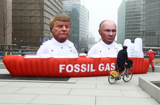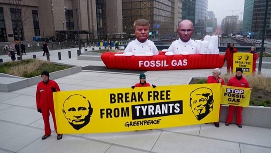 Greenpeace displays giant inflatables of US President Donald Trump and Russian President Vladimir Putin in front of the EU Council and European Commission to protest against the EU gas shift.