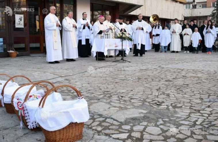 Tradiționala ceremonie de sfințire a bucatelor cu ocazia Paștelui Catolic, la care au participat mii de oameni, a avut loc duminică, în centrul municipiului Miercurea-Ciuc, autoritățile locale susținând că evenimentul este cel mai mare de acest gen din Bazinul Carpatic.