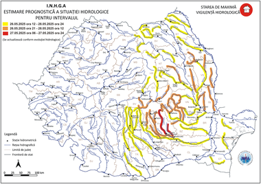 ”Având în vedere prognoza meteorologică actualizată şi evoluţia hidrologică anticipată în următoarele ore, Institutul Naţional de Hidrologie şi Gospodărire a Apelor (INHGA) a emis o Atenţionare Hidrologică de Cod Galben, valabilă începând de marţi, 6 mai 2025, ora 13:00, până miercuri, 7 mai 2025, ora 12:00”, a transmis, marţi, INHGA.