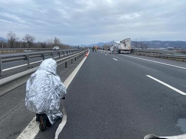 Hunedoara: Accident între două autocamioane pe autostrada A1 / Unul dintre TIR-uri transporta sulfat de amoniu, iar o parte din încărcătură a ajuns pe carosabil / Percimetru de siguranţă – FOTO