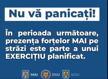 IGSU anunţă că sâmbătă, la ora 7.41, a fost declanşat exerciţiul naţional „SEISM 2025” care constă în punerea în aplicarea a Concepţiei naţionale de răspuns post-seism în cazul unui cutremur de 7.3 grade pe scara Richter. Instituţia face apel la populaţie să permită punerea în aplicare a procedurilor de răspuns. ”Nu vă panicaţi! În perioada următoare, prezenţa forţelor MAI pe străzi este parte a unui exerciţiu planificat”, transmite IGSU.