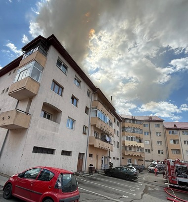 Focul a izbucnit într-un apartament situat la etajul al patrulea într-un bloc de locuinţe din localitatea Horezu, flăcrile extinzându-se rapid la acoperişul imobilului.
