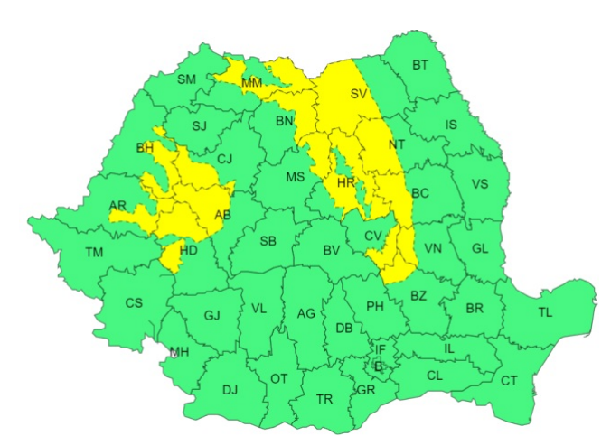 Ei au emis o atenţionare Cod galben privind intensificări ale vântului, valabilă în acelaşi interval, în Munţii Apuseni şi Carpaţii Orientali, mai exact în zone ale judeţelor Maramureş, Bistriţa-Năsăud, Mureş, Harghita, Covasna, Buzău, Vrancea, Bacău, Neamţ, Suceava, Cluj, Alba, Hunedoara, Arad şi Bihor.
