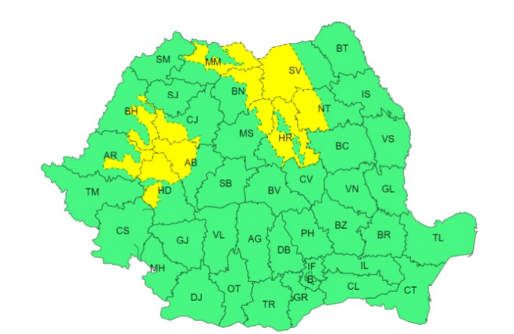 Codul galben vizează unele zone ale judeţelor Maramureş, Bistriţa-Năsăud, Mureş, Harghita, Neamţ, Suceava, Cluj, Alba, Hunedoara, Arad, Bihor.