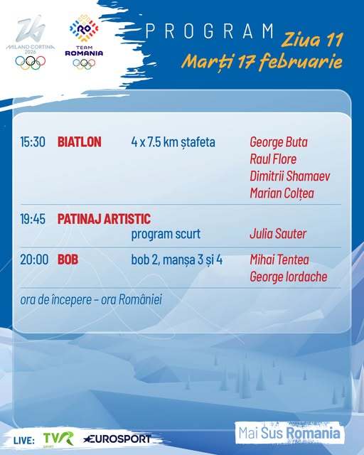 La biatlon, proba de 4×7.5 km ştafetă, vor evolua George Buta, George Colţea, Raul Flore şi Dmitrii Shamaev.