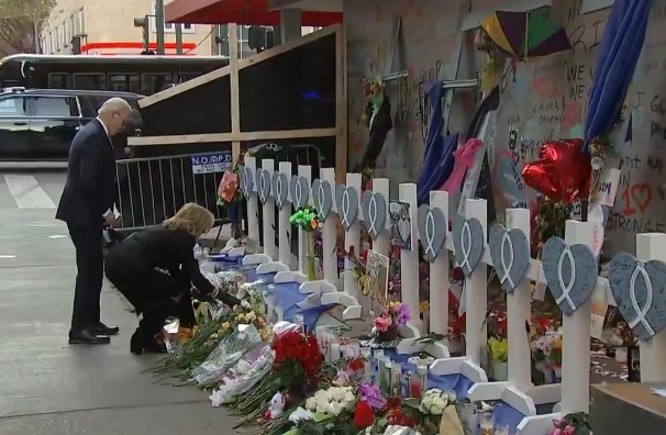 Preşedintele Biden şi soţia sa, Jill, au făcut o oprire pe Bourbon Street pentru a aduce un omagiu celor care au murit acolo, înainte de a se îndrepta spre o biserică pentru o slujbă comemorativă. Prima-doamnă a depus un buchet de flori în faţa unui altar improvizat. Preşedintele a stat alături de soţia sa şi şi-a făcut cruce.