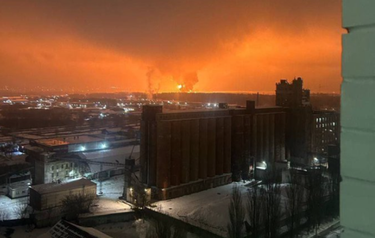 | Large flames and plumes of smoke were seen emitting from the Saratov oil refinery in the Saratov region in Russia.