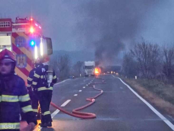 “În incendiu sunt implicate două autoturisme şi două autotrenuri, dintre care o cisternă cu GPL şi o cisternă cu cereale. Arderea se manifestă în continuare cu flacără deschisă şi degajare de fum. Până la acest moment nu sunt victime. Preventiv au fost evacuate 15 persoane din proximitate”, precizează DSU.