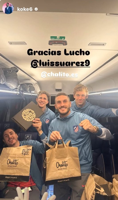 Pe reţelele lor de socializare, Marcos Llorente şi Koke au fost fotografiaţi în autocar după victorie cu comenzi de la Chalito, lanţul de restaurante al lui Luis Suarez, cei doi spanioli mulţumindu-i lui „Lucho”, un diminutiv afectuos al prenumelui Luis.