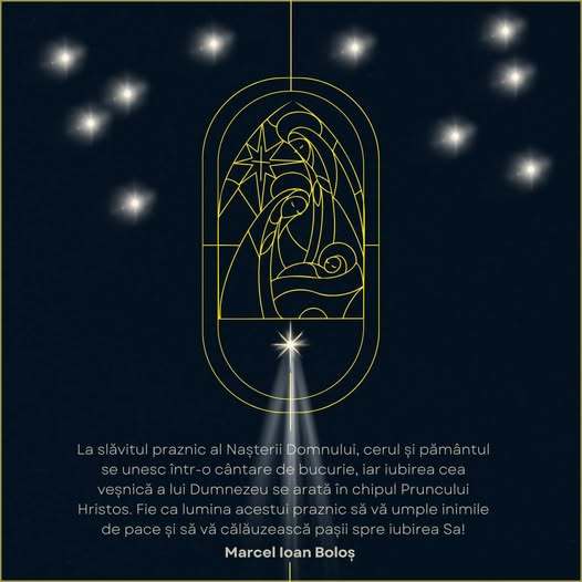 ”Dragilor, La slăvitul praznic al Naşterii Domnului, cerul şi pământul s-au unit într-un cânt de taină, iar lumina veşniciei a străpuns întunericul lumii, aşezând în ieslea smereniei scânteia dumnezeirii. Acolo, Maica Preacurată a devenit chivotul viu al mântuirii noastre”, scrie Boloş pe Facebook.