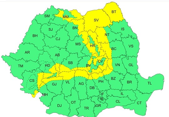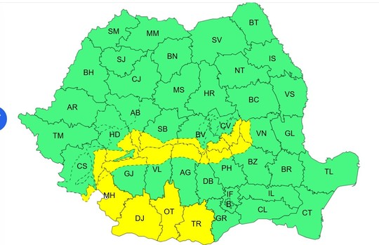 Marţi, până la ora 20.00, este în vigoare o atenţionare metrorologică cod galben vizând vestul şi sudul Olteniei şi sud-vestul Munteniei, unde vor fi intensificări ale vântului cu viteze de 50…70 km/h.