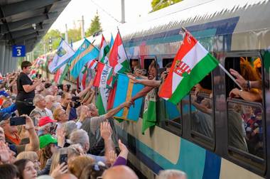 Trenul care transportă spre Şumuleu Ciuc aproximativ o mie de credincioşi din Ungaria este aşteptat în staţii cu gogoşi şi cozonaci. Bucurie, zâmbete şi veselie se vede pe feţele celor care se întâlnesc.