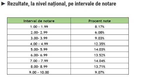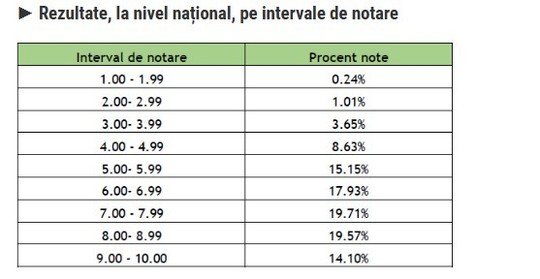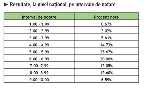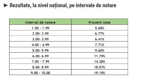 Procentul notelor mai mari sau egale cu 5: 73% (69,46% în 2025). 19,10% dintre elevi au luat note cuprinse între 9 şi 10.