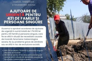 Ajutoare de urgenţă de peste 1,7 milioane lei pentru sprijinirea a 431 familii şi persoane singure aflate în situaţii dificile, Anunţul Ministerului Muncii
