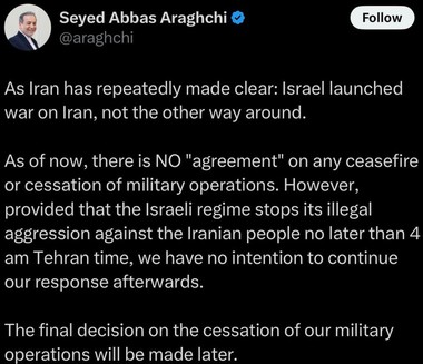 Ministrul iranian de externe, Abbas Araghchi, a declarat că în prezent nu există niciun acord de încetare a focului cu Israelul, dar a spus că Iranul îşi va opri răspunsul militar dacă Israelul îşi va opri loviturile asupra Iranului până la ora locală 4 a.m. acolo.