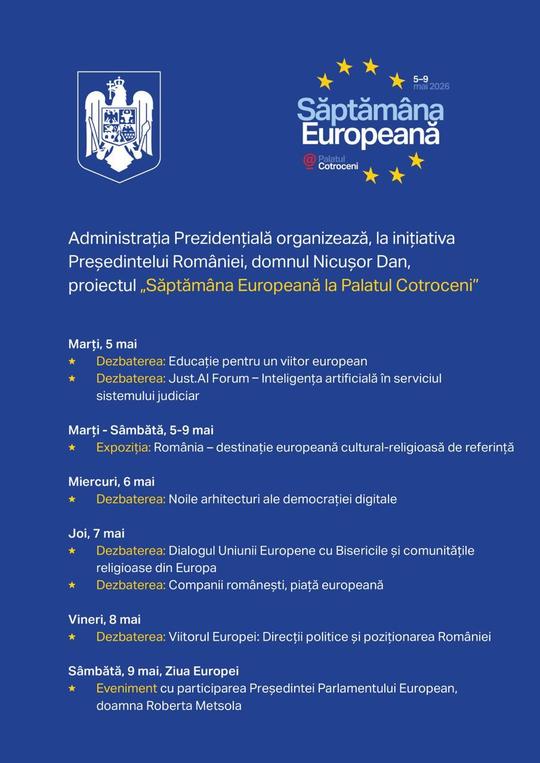 ”Administraţia Prezidenţială va organiza, în perioada 5-9 mai 2026, la iniţiativa Preşedintelui României, Nicuşor Dan, o serie de evenimente în cadrul proiectului «Săptămâna Europeană la Palatul Cotroceni». Obiectivul principal al acestui demers este încurajarea unor dezbateri structurate şi argumentate pe tematici de interes naţional în context european, cu privire la locul, rolul şi priorităţile României în Uniunea Europeană”, a transmis Administraţia Prezidenţială.