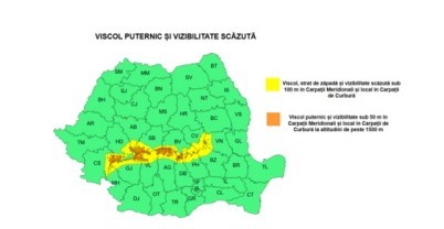 În acelaşi interval, va fi Cod portocaliu de viscol puternic şi vizibilitate sub 50 de metri, la altitudini în general de peste 1.500 de metri în Carpaţii Meridionali şi local în Carpaţii de Curbură. Aici, vântul va avea viteze la rafală de 80…110 km/h, va viscoli şi va troieni zăpada deja depusă şi va determina o vizibilitate sub 50 de metri.