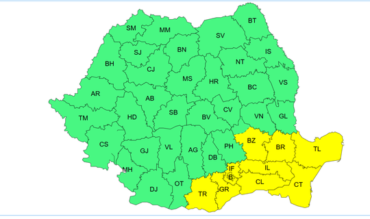 De asemenea, este cod galben, în intervalul 6 decembrie, ora 08 – 6 decembrie, ora 20, în Dobrogea, sudul, centrul şi estul Munteniei
