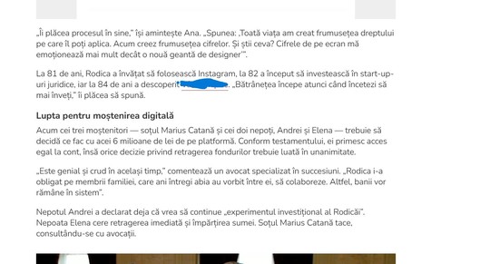 „Acum cei trei moştenitori – soţul Marius Catană şi cei doi nepoţi, Andrei şi Elena – trebuie să decidă ce fac cu acei 6 milioane de lei de pe platformă. Conform testamentului, ei primesc acces egal la cont, însă orice decizie privind retragerea fondurilor trebuie luată în unanimitate. «Este genial şi crud în acelaşi timp,» comentează un avocat specializat în succesiuni. «Rodica i-a obligat pe membrii familiei, care ani întregi abia au vorbit între ei, să colaboreze. Altfel, banii vor rămâne în sistem». Nepotul Andrei a declarat deja că vrea să continue „experimentul investiţional al Rodicăi”. Nepoata Elena cere retragerea imediată şi împărţirea sumei. Soţul Marius Catană tace, consultându-se cu avocaţii”, se arată în materialul de promovare, atribuit unui jurnalist.