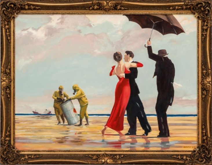 O pictură rară a artistului de stradă Banksy, inspirată de o pânză celebră a pictorului scoţian Jack Vettriano, recent decedat, a fost vândută marţi pentru aproape 4,3 milioane de lire sterline (peste 5 milioane de euro). Numită „Crude Oil (Vettriano)” şi supranumită uneori „Toxic beach”, pictura a fost vândută la Sotheby’s în capitala britanică. Pictura a fost prezentată pentru prima dată la expoziţia majoră a lui Banksy din 2005.