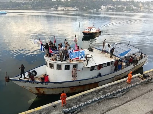 În apropiere de port, activişti au urcat pe acoperişul ambarcaţiunii – redenumită simbolic ”Granma 2.0”, un omaiu adus unui iaht folosit de către un grup de gherileri condus de către Fidel Castro la lansarea Revoluţiei din 1956.
