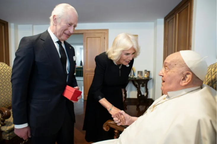 Miercuri el l-a primit într-o audienţă privată pe Charles al III-lea al Angliei şi pe regina Camilla, după ce o vizită programată iniţial marţi a fost anulată la sfârşitul lui martie, din cauza stării fragile a sănătăţii Suveranului Pontif.