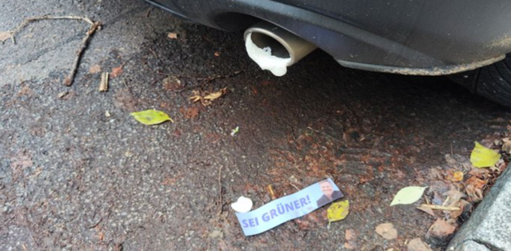 Pe autocolant apare ministrul Economiei Robert Habeck, candidatul Verzilor (ecologişti) la Cancelarie, şi sloganul ”Fii mai verde!”, potrivit unor fotografii publicate de către săptămânalul Der Spiegel.