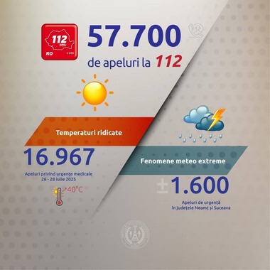 ”În perioada de valabilitate a primului cod roşu extins de caniculă şi a altor fenomene meteo extreme pentru mai mult de jumătate din ţară, în intervalul 26.07.2025, ora 10:00 – 28.07.2025, ora 10:00, operatorii STS ai Serviciului de urgenţă 112 au preluat şi procesat 57.700 de apeluri la numărul unic de urgenţă 112”, anunţă, luni, STS, într-un comunicat de presă.