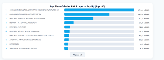 Potrivit statisticii prezentate pe platformă, CNAIR se află pe primul loc în topul beneficiarilor, raportat la plăţi, cu o valoare de 1.719,20 milioane euro. CNAIR este urmată de CFR cu 1,1 miliarde de euro şi la mare distanţă de MIPE, Sectorul 4 al Capitalei şi Ministerul Finanţelor.