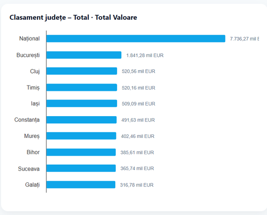 De asemenea, platforma prezintă un top al judeţelor care au atras fonduri prin PNRR. După Capitală, în top se află jjdeţele Cluj, Timiş, Iaşi, Constanţa, Mureş, Bihor, Suceava şi Galaţi.