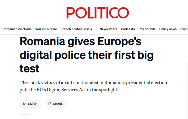Victoria şocantă a unui ultranaţionalist în alegerile prezidenţiale din România pune în lumina reflectoarelor Legea serviciilor digitale a UE (DSA). Noile norme ale Uniunii Europene privind reţelele sociale sunt testate la limită de acuzaţiile privind o campanie pe TikTok orchestrată pentru fraudarea alegerilor prezidenţiale, iar DSA nu a fost niciodată gândită ca o soluţie rapidă pentru evenimente precum alegerile din România, scrie POLITICO.